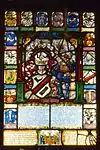De gueules, à la coupe couverte d'or et à la bordure engrelée de même, au chef d'azur, chargé d'un agneau pascal, accosté de deux fleurs de lis d'or |