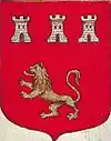 De gueules au lion d'or, surmonté de trois tours d'argent. |