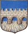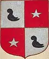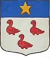 D'argent au lion de sable, la queue fourchée passée en sautoir, chargé d'une étoile d'or sur l'épaule. |