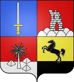 De gueules à l'aigle d'or accompagnée d'un orle de besants d'or.[29] Alias un orle de fers de lance d'argent.[29] |