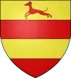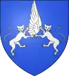 D'azur, au limier d'argent passant sur une terrasse de sinople ; au chef cousu de gueules chargé de trois étoiles d'or.[1] |