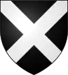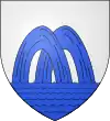 D'azur, au sautoir d'or, accompagné de trois besants du même, un en chef, deux en flancs, et en pointe une rivière ondée d'argent.[1] |