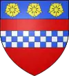 De gueules, à la fasce échiquetée de trois traits d'argent et d'azur ; au chef d'azur chargé de trois roses d'or.[1] |