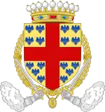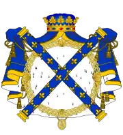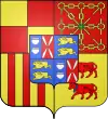 Ecartelé : aux I et IV, de gueules semés de trèfles d'or, à deux bars adossés de même (Clermont-en-Beauvaisis) ; aux II et III, bandé d'or et de gueules ; au franc-quartier d'or chargé d'une croix de gueules cantonnée de seize alérions d'azur, le franc-quartier lui-même cantonné d'un franc-quartier d'argent à une molette de sable.[14] | |