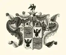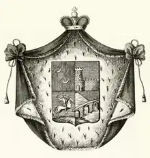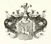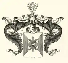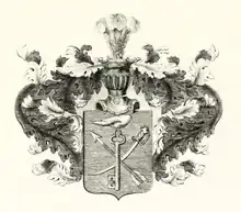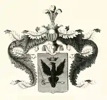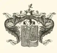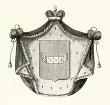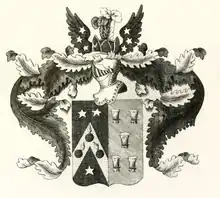 Apraxine ; olim Opraxine Maison de noblesse immémoriale[48], suivie depuis le XIVe siècle, d'origine tatare[49] et boyarde; les annales la font remonter à un prince de la Horde d'or, Solohmir-Mirza Miroslavitch[50], qui rallia en 1371 le prince de Riazan, Oleg Ivanovitch (ru) ; après son baptême sous le nom d'Ivan[51], il fut apanagé par le prince qui lui donna pour épouse sa propre sœur, Anastasia Ivanovna. Maison illustrée notamment par le général comte Pierre Matveïévitch (ru) (1659-1728), gouverneur de Saint-Pétersbourg, l'amiral comte Théodore Matveïévitch (1661-1728), créateur de la marine russe et compagnon d'armes de Pierre Ier, le comte André Matveïévitch (ru) (1663-1731), ami intime de Pierre Alexéïévitch, leur sœur, la tsarine Marthe Matveïevna (1664-1716), deuxième épouse du tsar Fiodor Alexéïévitch, le généralissime comte Stéphane Fiodorovitch (1702-1758), son fils le général comte Stéphane Stépanovitch (1757-1827), gouverneur de Smolensk, le général comte Pierre Ivanovitch (ru) (1787-1852). |