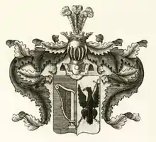 Alymov ; olim Alymoff Maison d'ancienne noblesse, d'origine tatare[43], enregistrée à Riazan, Orel et Smolensk, remontant à Grégoire Alymoff, apanagé à Riazan au tout début du XVIe siècle ; famille illustrée par la harpiste virtuose Glafyra Ivanovna (ru)[44] (1758-1826). |