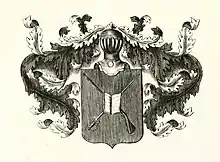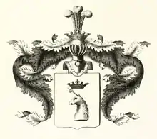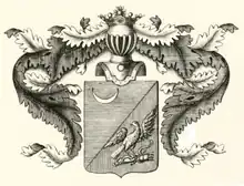 Bakhmetiev ou Bakhmetev ; olim Bakhmetieff, Bakhmetioff ou Bakhmiotoff ou Bakhmeteff Maison d'ancienne noblesse, d'origine tatare, fondée par Aslam Jérémie[66] Bakhmet, qui se mit en 1469 au service du grand-prince Vassili ; enregistrée dans la noblesse des gouvernements de Novgorod, Moscou, Penza, Saratov et Kalouga ; illustrée par le sénateur Ivan Ivanovitch (1690-1780), le colonel Jacques Khrisanfovitch[67], intime de l'empereur Pierre Alexéïevitch et commandant de la forteresse Pierre-et-Paul, la comtesse[68] Varvara Alexéïévna, épouse Protassova, (1770-1847), préceptrice des enfants de l'empereur Alexandre Pavlovitch, les frères généraux Nicolas Nikolaïévitch (1772-1831) et Alexis Nikolaïévitch[69] (1774-1841), tous deux commandants de l'Armée impériale, le fils de ce dernier, le général comte[70] Nicolas Alexeïévitch Protassoff-Bakhmétieff (ru) (1834-1907), gouverneur d'Astrakhan et ataman des Cosaques d'Astrakhan, le compositeur Nicolas Ivanovitch (ru) (1807-1891)), et l'écrivaine religieuse Alexandra Nikolaïévna (ru) (1823-1901), née Khovrina. |