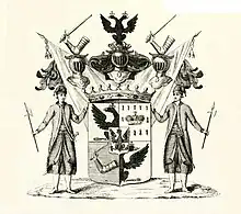C'est ainsi que les familles riourikides y furent répertoriées et entre-classées, dotées d'armes vraisemblablement inspirées de thèmes issus de l'antique vexillologie russe et reprenant généralement les symboles des bonnes villes dont leurs ancêtres avaient assuré le gouvernement[12]. Les nobles titrés, les anoblis[13], les courtisans virent leurs blasons[14] enrichis de pièces d'honneur (aigle[15], étoile(s)[16], besant(s), etc.) et/ou de rôle (grenade(s)[17], abeille(s), ruche, caducée[18], etc.), évoquant la fonction du chef de famille dans l'Empire au moment de l'enregistrement des armes. Le culte familial (contemporain ou originel) est parfois aussi mentionné, par une croix pour les familles d'origine chrétienne, par une étoile de David, pour celles de confession israélite, ou par un croissant, pour celles d'origine tatare ou turque, etc.