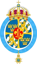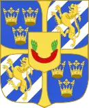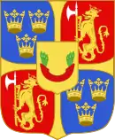 Écartelé à la croix pattée d'or, qui est la Croix de Saint-Eric, cantonnée en 1 et 4, d'azur à trois couronnes d'or posées 2 et 1 qui est de Suède moderne, en 2 et 3, d'azur, à trois barres ondées d'argent, au lion couronné d'or armé et lampassé de gueules, brochant sur le tout, qui est de Suède ancien, sur le tout, tranché d'azur et de gueules à la banche d'argent et à la gerbe d'or brochant sur le tout qui est de Vasa[18].