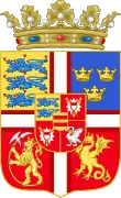 Ecartelé : à la croix pattée d'argent bordée de gueules, qui est le Danebrog, cantonnée en I et IV, d'or, à neuf cœurs de gueules, posés en trois pals, à trois lions léopardés d'azur, armés et lampassés de gueules, couronnés du champ, brochant sur-le-tout (de Danemark) ; en II, de gueules, au lion couronné d'or, tenant dans ses pattes une hache danoise d'argent, emmanchée du second (de Norvège ancien) ; en III, , de gueules au dragon d'or (du Royaume des Vandales) ; sur-le-tout écartelé : 1 et 4, d'or, à deux lions léopardés d'azur, armés et lampassés de gueules (de Schleswig) ; en 2, de gueules, à la feuille d'ortie d'argent (de Holstein) ; en 3, de gueules, au cygne d'argent, becqué, membré et colleté d'une couronne d'or (Stormarn) ; sur-le-tout-du-tout, d'or à deux fasces de gueules (de Oldenbourg). |