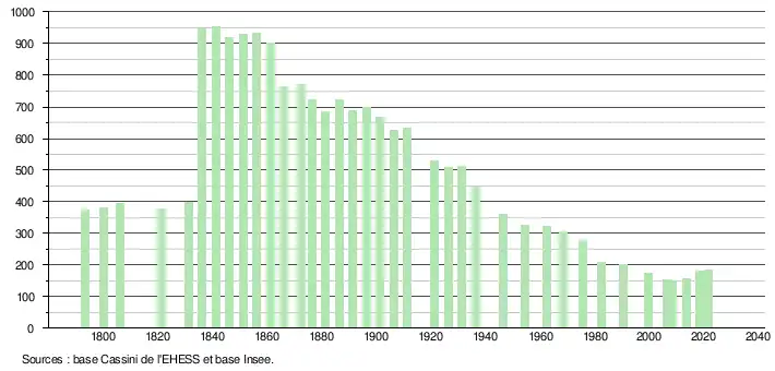 L'évolution du nombre d'habitants est connue à travers les recensements de la population effectués dans la commune depuis 1793. Pour les communes de moins de 10 000 habitants, une enquête de recensement portant sur toute la population est réalisée tous les cinq ans, les populations légales des années intermédiaires étant quant à elles estimées par interpolation ou extrapolation[15]. Pour la commune, le premier recensement exhaustif entrant dans le cadre du nouveau dispositif a été réalisé en 2008[16].