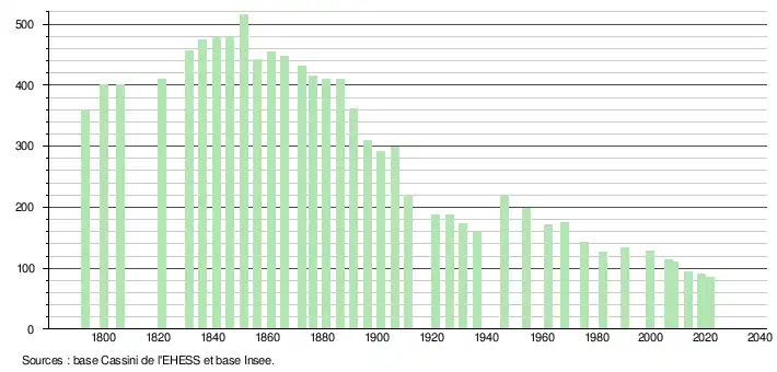 L'évolution du nombre d'habitants est connue à travers les recensements de la population effectués dans la commune depuis 1793. Pour les communes de moins de 10 000 habitants, une enquête de recensement portant sur toute la population est réalisée tous les cinq ans, les populations légales des années intermédiaires étant quant à elles estimées par interpolation ou extrapolation[16]. Pour la commune, le premier recensement exhaustif entrant dans le cadre du nouveau dispositif a été réalisé en 2008[17].
