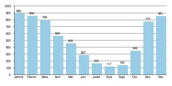 Le débit instantané maximal de 29,00 m3/s a été constaté le en même temps qu'une hauteur maximale instantanée de 211 cm ou 2,11 m[note 2]. Le débit journalier maximal de 12,60 m3/s a été constaté le [2].