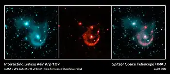 La paire de galaxies Arp 107 imagée dans le domaine de l'infrarouge par le télescope spatial Spitzer.