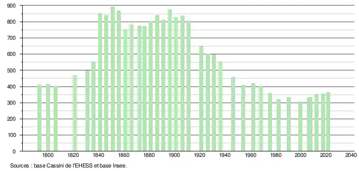 L'évolution du nombre d'habitants est connue à travers les recensements de la population effectués dans la commune depuis 1793. Pour les communes de moins de 10 000 habitants, une enquête de recensement portant sur toute la population est réalisée tous les cinq ans, les populations légales des années intermédiaires étant quant à elles estimées par interpolation ou extrapolation[21]. Pour la commune, le premier recensement exhaustif entrant dans le cadre du nouveau dispositif a été réalisé en 2007[22].