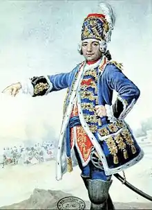 - Voir également: Liliane et Fred Funcken, L'Uniforme et les Armes des soldats de la guerre en dentelle, Tome 2, figurines 9 de la planche « France, troupes légères » p.39 et Charles Pierre Victor Pajol : Les guerres sous Louis XV, Tome 7, p.234.