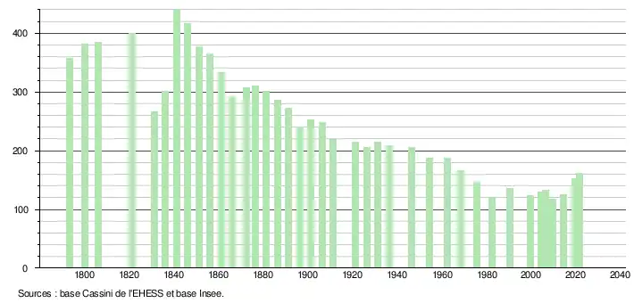 L'évolution du nombre d'habitants est connue à travers les recensements de la population effectués dans la commune depuis 1793. Pour les communes de moins de 10 000 habitants, une enquête de recensement portant sur toute la population est réalisée tous les cinq ans, les populations légales des années intermédiaires étant quant à elles estimées par interpolation ou extrapolation[44]. Pour la commune, le premier recensement exhaustif entrant dans le cadre du nouveau dispositif a été réalisé en 2004[45].