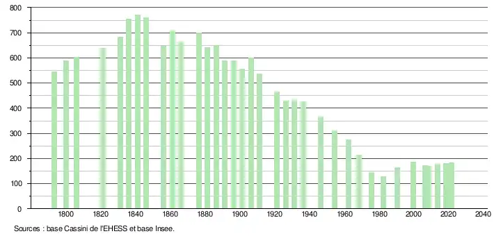 L'évolution du nombre d'habitants est connue à travers les recensements de la population effectués dans la commune depuis 1793. Pour les communes de moins de 10 000 habitants, une enquête de recensement portant sur toute la population est réalisée tous les cinq ans, les populations légales des années intermédiaires étant quant à elles estimées par interpolation ou extrapolation[27]. Pour la commune, le premier recensement exhaustif entrant dans le cadre du nouveau dispositif a été réalisé en 2008[28].