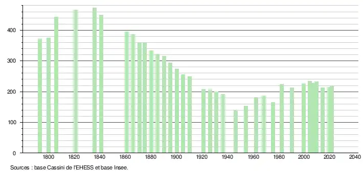 L'évolution du nombre d'habitants est connue à travers les recensements de la population effectués dans la commune depuis 1793. Pour les communes de moins de 10 000 habitants, une enquête de recensement portant sur toute la population est réalisée tous les cinq ans, les populations légales des années intermédiaires étant quant à elles estimées par interpolation ou extrapolation[16]. Pour la commune, le premier recensement exhaustif entrant dans le cadre du nouveau dispositif a été réalisé en 2004[17].