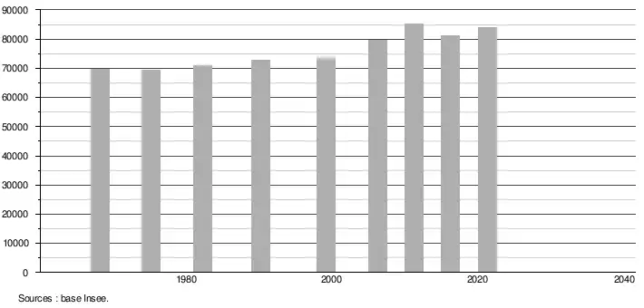- Population municipale légale en vigueur au 1er janvier 2024, millésimée 2021, définie dans les limites territoriales en vigueur au 1er janvier 2023, date de référence statistique : 1er janvier 2021.