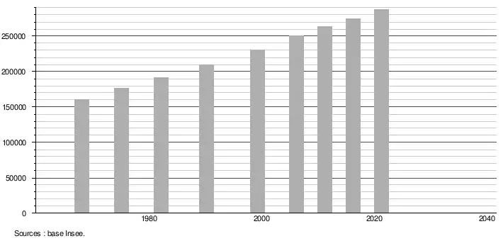 - Population municipale légale en vigueur au 1er janvier 2024, millésimée 2021, définie dans les limites territoriales en vigueur au 1er janvier 2023, date de référence statistique : 1er janvier 2021.