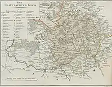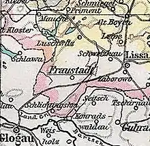 Lors des réformes administratives prussiennes, une réforme des arrondissements est menée dans le district de Posen le 1er janvier 1818, dans laquelle l'arrondissement de Fraustadt cède le territoire autour de la ville de Schmiegel à l'arrondissement de Kosten et le territoire autour de Priment à l'arrondissement de Bomst[4]. Le chef-lieu de l'arrondissement et siège du bureau de l'arrondissement est Fraustadt.