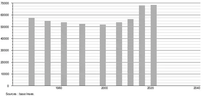 - Population municipale légale en vigueur au 1er janvier 2024, millésimée 2021, définie dans les limites territoriales en vigueur au 1er janvier 2023, date de référence statistique : 1er janvier 2021.