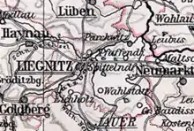 Dans le cadre de la régularisation des frontières entre les districts de Liegnitz et Reichenbach, le village de Poselwitz est transféré de l'arrondissement de Striegau à l'arrondissement de Liegnitz en 1817 et en 1818, les villages de Panzkau et Simsdorf sont transférés de l'arrondissement de Liegnitz à l'arrondissement de Striegau[6]. Lors de la réforme des arrondissements dans le district voisin de Breslau le 1er janvier 1818, l'arrondissement de Liegnitz céda les villages de Blumerode, Borne, Maltsch, Maserwitz, Raussen, Rachen et Wültschkau à l'arrondissement de Neumarkt[7].