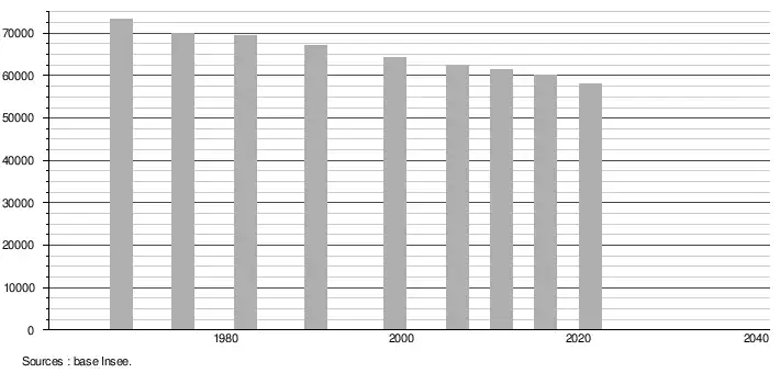 - Population municipale légale en vigueur au 1er janvier 2024, millésimée 2021, définie dans les limites territoriales en vigueur au 1er janvier 2023, date de référence statistique : 1er janvier 2021.