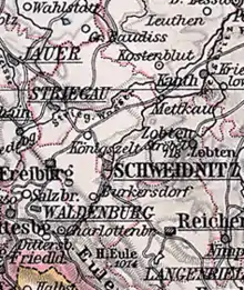 Le 1er janvier 1818, le nouveau arrondissement de Waldenburg est formé à partir de la partie sud-ouest de l'arrondissement de Schweidnitz[6]. Après la dissolution du district de Reichenbach, les arrondissements de Schweidnitz et de Waldenburg sont fusionnés le 1er mai 1820 et affecté au district de Breslau.