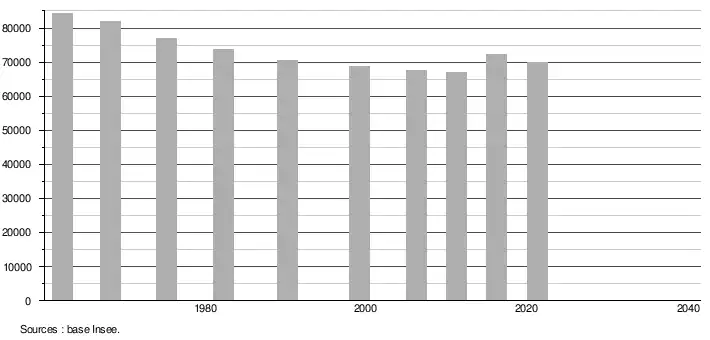 - Population municipale légale en vigueur au 1er janvier 2024, millésimée 2021, définie dans les limites territoriales en vigueur au 1er janvier 2023, date de référence statistique : 1er janvier 2021.