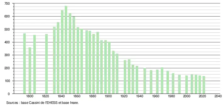 - Population municipale légale en vigueur au 1er janvier 2024, millésimée 2021, définie dans les limites territoriales en vigueur au 1er janvier 2023, date de référence statistique : 1er janvier 2021.