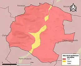 Le retrait-gonflement des sols argileux est susceptible d'engendrer des dommages importants aux bâtiments en cas d’alternance de périodes de sécheresse et de pluie. La totalité de la commune est en aléa moyen ou fort (94,5 % au niveau départemental et 48,5 % au niveau national). Sur les 60 bâtiments dénombrés sur la commune en 2019, 60 sont en aléa moyen ou fort, soit 100 %, à comparer aux 93 % au niveau départemental et 54 % au niveau national. Une cartographie de l'exposition du territoire national au retrait gonflement des sols argileux est disponible sur le site du BRGM[22],[Carte 3].