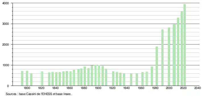 L'évolution du nombre d'habitants est connue à travers les recensements de la population effectués dans la commune depuis 1793. Pour les communes de moins de 10 000 habitants, une enquête de recensement portant sur toute la population est réalisée tous les cinq ans, les populations légales des années intermédiaires étant quant à elles estimées par interpolation ou extrapolation[40]. Pour la commune, le premier recensement exhaustif entrant dans le cadre du nouveau dispositif a été réalisé en 2007[41].