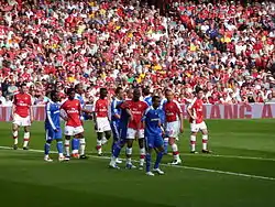 La saison 2003-2004 est historique : Arsenal est officiellement sacré champion, pour la treizième fois de son histoire, sur le terrain de Tottenham le 24 avril, mais surtout l'équipe termine le championnat invaincue, une première en Angleterre depuis 1889[10]. Elle est alors surnommée « invincible Arsenal[11] » – bien qu'elle soit éliminée des coupes, et notamment en quart de finale de Ligue des champions par Chelsea. Le , les Gunners s'inclinent à Old Trafford, le terrain de Manchester United, mettant fin à une série record de 49 matchs sans défaite. Après le match, une bagarre éclate dans le tunnel. La rencontre est surnommée the Battle of the Buffet (en) par la presse anglaise.