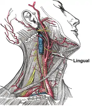 L'artère linguale est la troisième branche de la carotide externe. Elle naît sur sa face antérieure, entre l'artère thyroïdienne supérieure et l'artère faciale. Il existe de nombreuses variations anatomiques : on peut notamment observer la présence d'un tronc commun avec les artères faciale, thyroïdienne supérieure, maxillaire et plus rarement avec l'artère pharyngienne ascendante[1].
