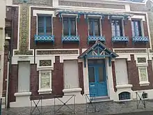 - La façade présente une alternance de pierre de taille (soubassement, linteaux et corniches), de céramique brique et de bois peint pour les éléments saillants. Entre les niveaux, des cartouches encadrent des carreaux émaillés portant inscription « Établissement Municipal, bains chauds, hydrothérapie ». À chaque extrémité de la façade, les hauts cartouches sont décorés de guirlandes de fleurs avec nœuds et losanges.