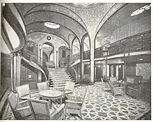 Dans les années 1920 et 1930, avant l'apparition de l'aviation commerciale au long cours, le principal moyen de transport intercontinental est le paquebot. La concurrence féroce que se livrent les compagnies comme notamment la Cunard-White star (Grande-Bretagne), la HAPAG (Allemagne), la Compagnie générale transatlantique ou plus familièrement « Transat » (France) et la Compagnie Flote riunite Italiane (Italie), se double d'une lutte de prestige entre nations pour mettre en ligne des paquebots toujours plus rapides, élégants et confortables. À partir des années 1920, les chantiers navals commencent à faire le choix du modernisme pour l'aménagement intérieur et la décoration des navires. Alors que les navires anglais Queen Mary et Queen Elizabeth restent empreints d'un classicisme assez sage dans la continuité de leurs aînés les Mauretania, Lusitania ou Titanic, la Compagnie générale transatlantique ose le modernisme pour le paquebot Île de France (1927) et surtout le Normandie de 1935, véritable cathédrale sur mer de l'Art déco avec des décorateurs tels que Louis Süe et André Mare, Jean Dunand, Paul Jouve, Patout et Pacon, Raymond Subes, Jacques Carlu, André Carlhian, etc.[17]. Les Allemands suivent le mouvement avec le Bremen et l'Europa dont les espaces intérieurs ont été confiés au grand architecte Paul Troost. L'Italie n'est pas en reste avec les deux paquebots Rex et Conte di Savoia, emblématiques de l'époque mussolinienne, dont la décoration combine modernisme et réinterprétation de l'Antiquité romaine.