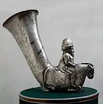 ![]() | ![]() | Les rhytons en argent de l'époque des Achéménides associent des éléments orientaux de la Grèce antique et d'autres de l'art d'Urartu. Cet aspect a permis aux scientifiques de parler de l'influence de l'art d'Urartu sur celui de la Perse[19]. |