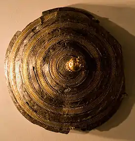 | Parure féminine en argent (pectoral) avec une représentation du dieu Haldi (sur le trône) et son épouse, la déesse urartienne Arubani. Le pectoral est conservé par un musée de Berlin. | Couvercle de chaudron en argent garni d'une figure représentant une grenade. Mentionné comme propriété du tsar Argishti Ier, Musée d'histoire de l'Arménie. |