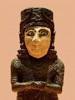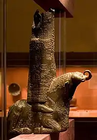 | Figurines en bronze, parties du trône conservé à Saint-Pétersbourg au musée de l'Ermitage, Russie. Les figurines en bronze ont conservé des traces de dorure. Les visages des bêtes sauvages et de la divinité sa trouvant à droite étaient en pierre, probablement incrustés de pierres précieuses, de sorte que tous les visages ont été brisés et non conservés. | ||||