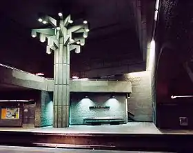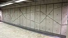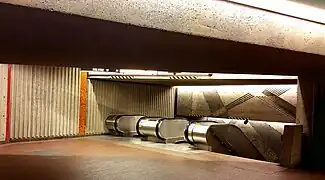 | De Varennes, Guy et Almas, Mathieu | Reliefs | 1984 | Béton cannelé | Incisions de motifs angulaires dans les murs de la station. | ![]() | ||