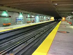 | De L'Église | Verte | Théberge, Claude | Bas-reliefs | 1978 | Béton cannelé | Des lignes gravées dans le béton couvrent la station et forment des fresques dynamiques. | ![]() |
