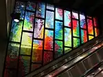 | Côte-des-Neiges | Bleue | Bettinger, Claude | Verrières | 1988 | Verre antique | Deux verrières formées de faisceaux de lignes colorées. | ![]() |