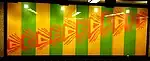 | Mousseau, Jean-Paul | Murale | 1976 | Plastique laminé, verre trempé | Alternance de 11 panneaux de plastique laminé verticaux jaunes et verts et décorés d'un motif triangulaire stylisé qui semble indiquer une direction. | ![]() | ||