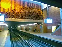 | Morelli, Michel | Bancs | 1988 | Granit, acier peint | L'œuvre consiste en une série de bancs qui s'intègre à l'architecture de la station. Les tubes d’acier rouges rappellent les porte-bagages des anciens tramways. | ![]() | ||