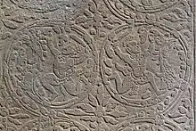 Temple de Preah Kô (v. 880). Linteau sculpté dans le grès. Décor foisonnant