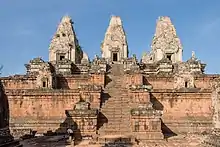 Matériaux. L'art qui s'est conservé est issu des pratiques religieuses[44]. Les temples, leurs décors et leurs statues de culte nécessitaient des matériaux qui résistent au temps ; au Cambodge ce fut, majoritairement, la brique et le grès. Pour l'immense majorité des constructions[45], les habitations et les palais qui ont tous disparu on utilisait des matériaux plus fragiles mais plus aisés à travailler, comme le bois, le bambou, les palmes tressées, et des toits de tuiles et épis de faîtage[46], pour les palais, différentes de celles des habitations de type chinois. Les Khmers ont aussi mis en œuvre du sable [47] et de la latérite, cette dernière pour les volumes construits les plus grands et les soubassements, non décorés.