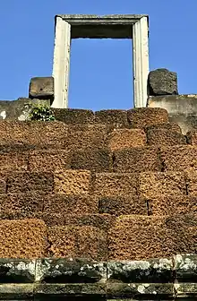 La latérite est extraite des barays. Lorsqu'elle est sèche, c'est un matériau solide et léger comme une éponge dure, qui réagit très bien au passage de la saison humide à la saison sèche. Elle sert le plus souvent pour les fondations et sur certains murs d’enceinte pour laquelle elle est parfaitement adaptée, et ne reçoit pas de décor sinon par plaquage de grès sculpté. La maçonnerie de brique à joints très fins est le matériau le plus employé dès le VIIe siècle, moins pendant toute la période classique. Chaque lit de brique, lié à un encorbellement, est décalé par rapport au précédent. Les briques étant posées en quinconce, elles garantissent ainsi la stabilité de l'ensemble. Ce principe qui n'est pas appliqué pour les murs simples, n'est plus appliqué dans les constructions en grès. Les briques étaient rodées (usées l'une contre l'autre) de manière à obtenir des surfaces d'adhérence bien lisses. La poussière de brique et un mortier de chaux assuraient l'efficacité des joints[77], quand il y en avait[78]. Mais seulement la couche externe est soigneusement assemblée-collée tandis que l'intérieur du mur, très épais, n'est qu'un blocage de débris de briques et de terreLaur, 2002, p. 76. Les dislocations sont alors bien probables.