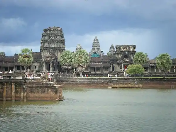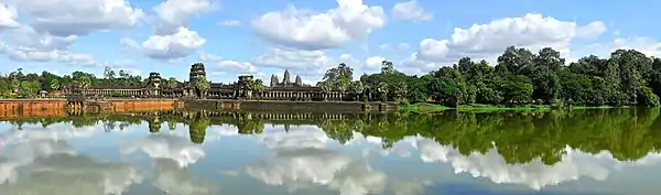 Dans ce pays quasiment noyé sous les pluies diluviennes qui font déborder le Mékong au point qu'il remplisse un immense lac, le Tonlé Sap, la construction doit tenir compte de cette eau qui permet de nourrir le pays. Le site archéologique d'Angkor comporte plus de 200 temples sur 400 km². Les temples, mais aussi les palais, sont souvent placés à proximité immédiate de vastes réservoirs, les baray, nécessaires à l'irrigation des parcelles situées à proximité. Angkor abrite les quatre plus grands baray du pays, dont le plus grand approche 8 x 2,2 km et 4 m de profondeur. Dans de telles conditions, les Khmers, à l'époque "classique", ont employé pour l'assise ou la base des constructions angkoriennes la latérite, une roche dont la sédimentation produit une structure à vacuoles (des vides dans la roche, quasiment en nid d'abeille) qui favorisent sa tenue en période humide comme en période sèche, où l'eau retenue est progressivement évacuée[80]. Au centre d'Angkor, un bassin entouré par une enceinte percée de trois gopura qui contient, sur un îlot, le temple du Mebon occidental témoigne du défi qui consistait à construire avec de telles contraintes, mais la restauration du temple en question (2013-2018) fut un autre défi[81].